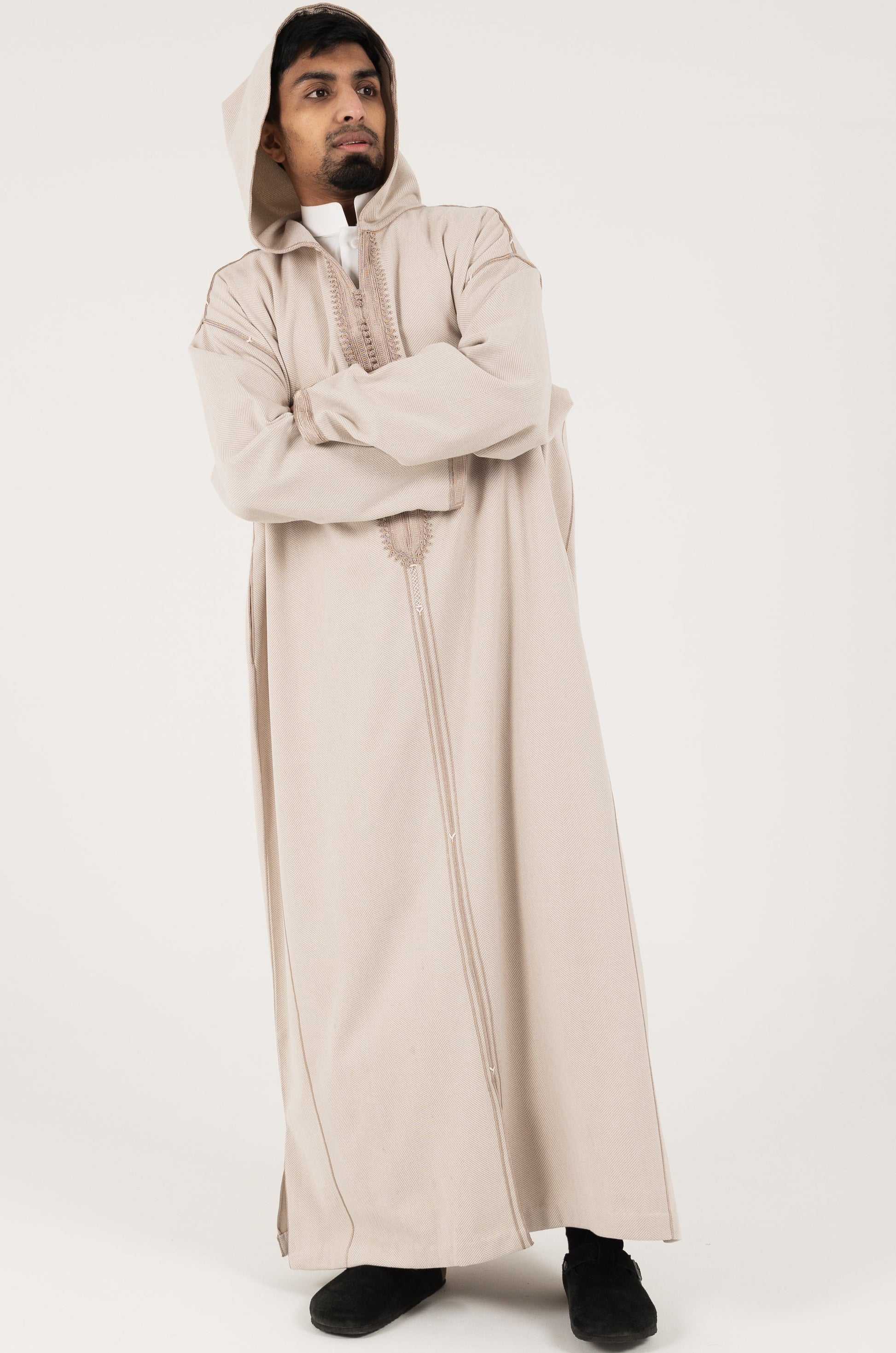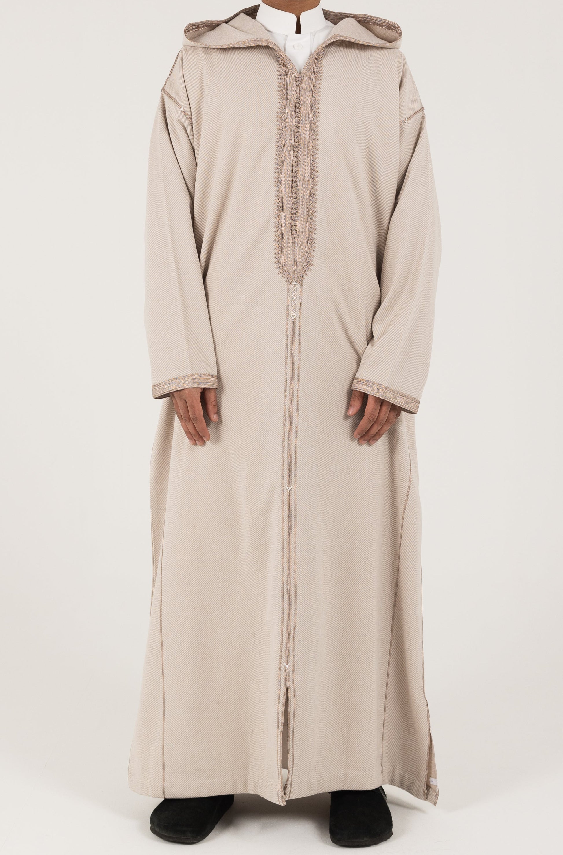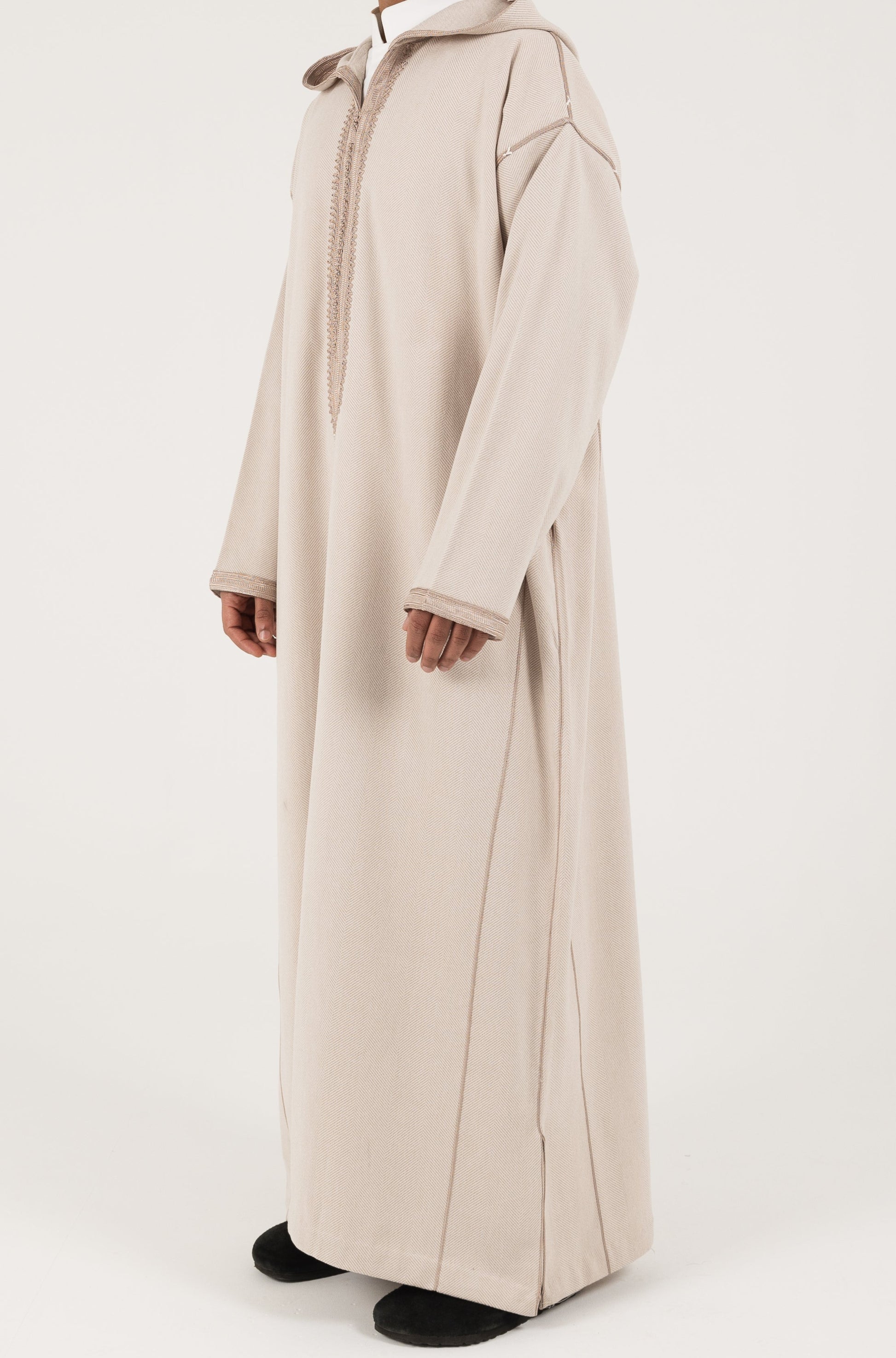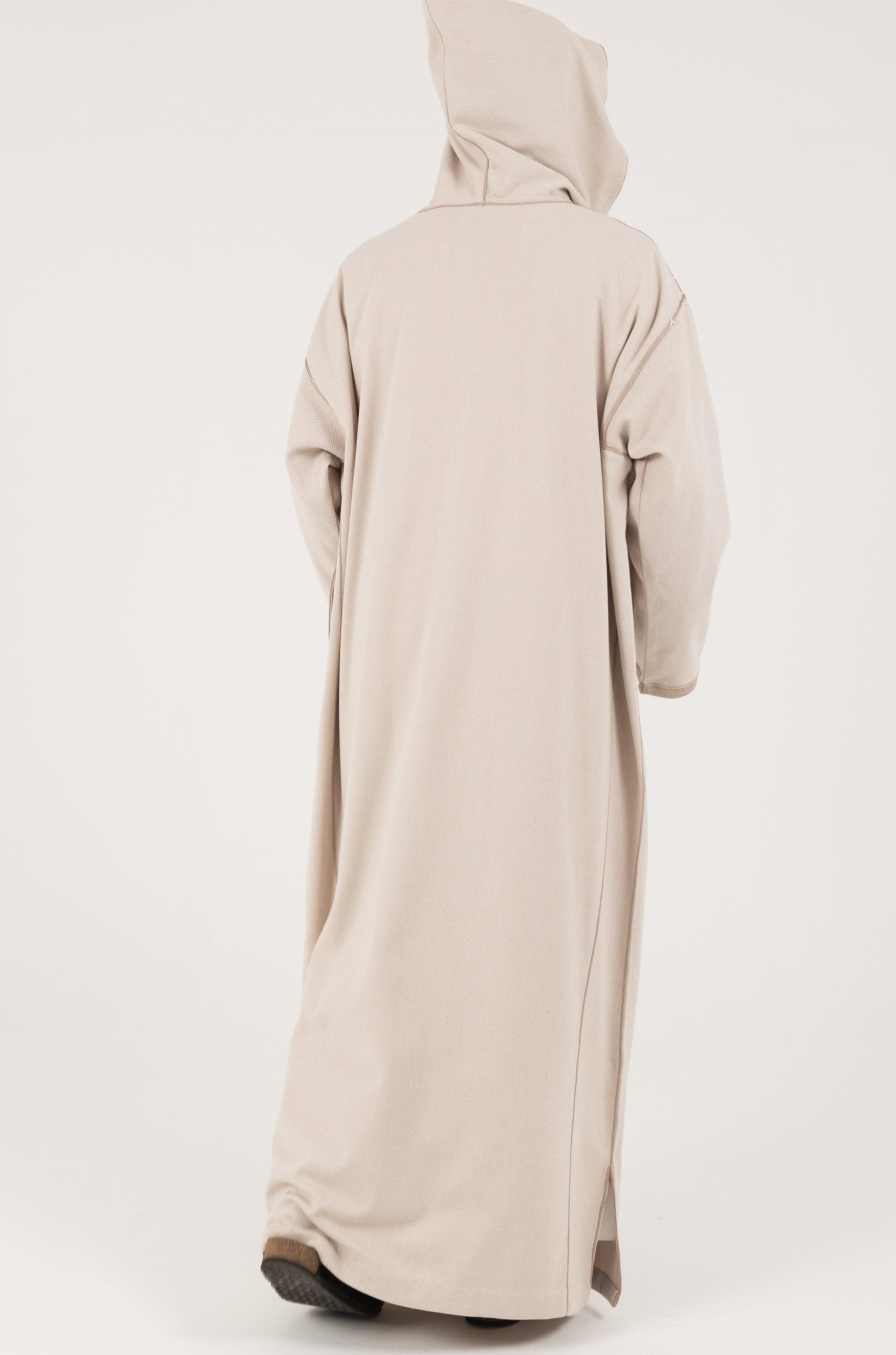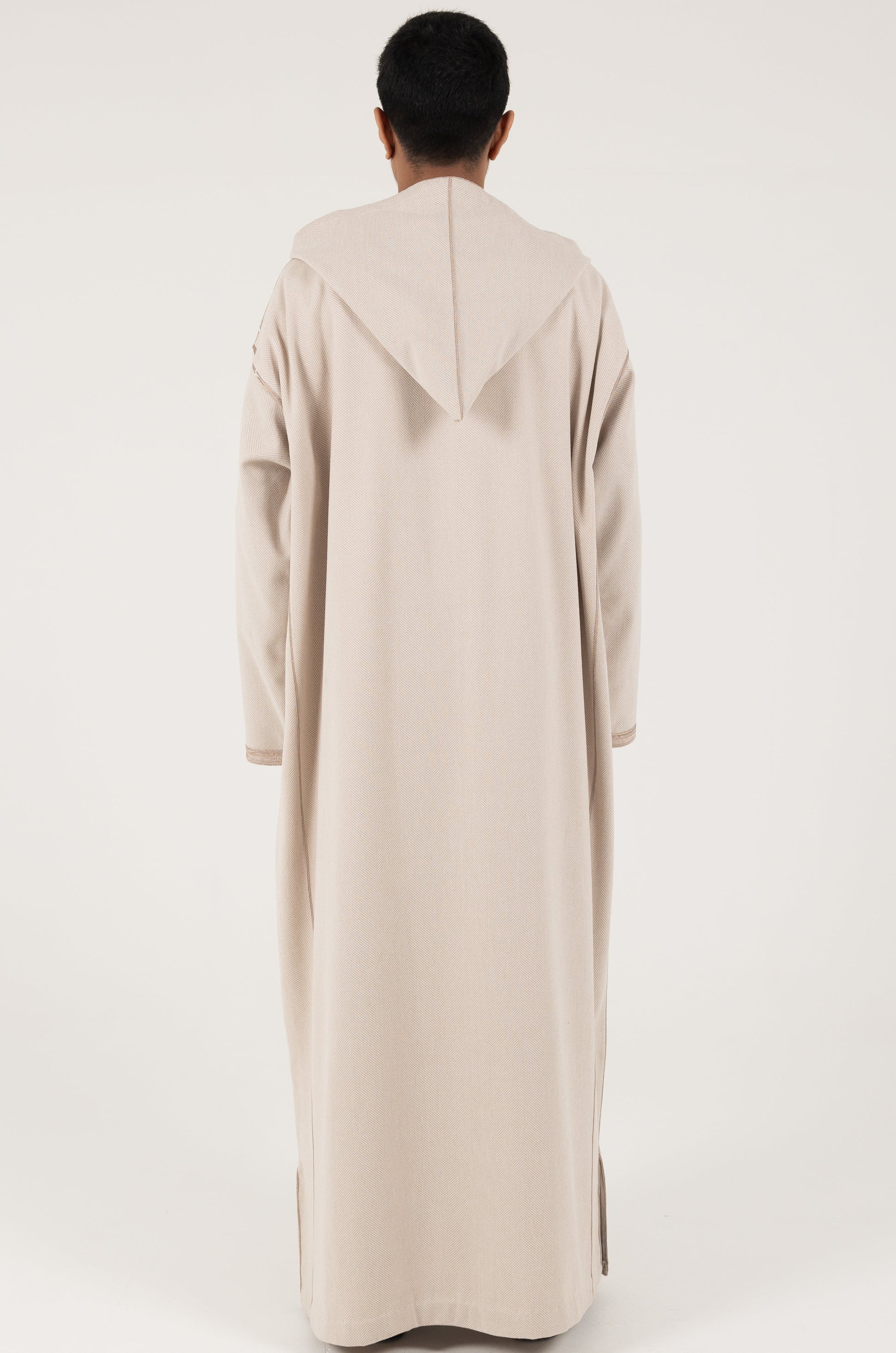 This winter herringbone thobe is crafted from thick, textured fabric for added warmth, featuring a refined pattern, comfortable fit, and classic design that blends seasonal comfort with timeless elegance.