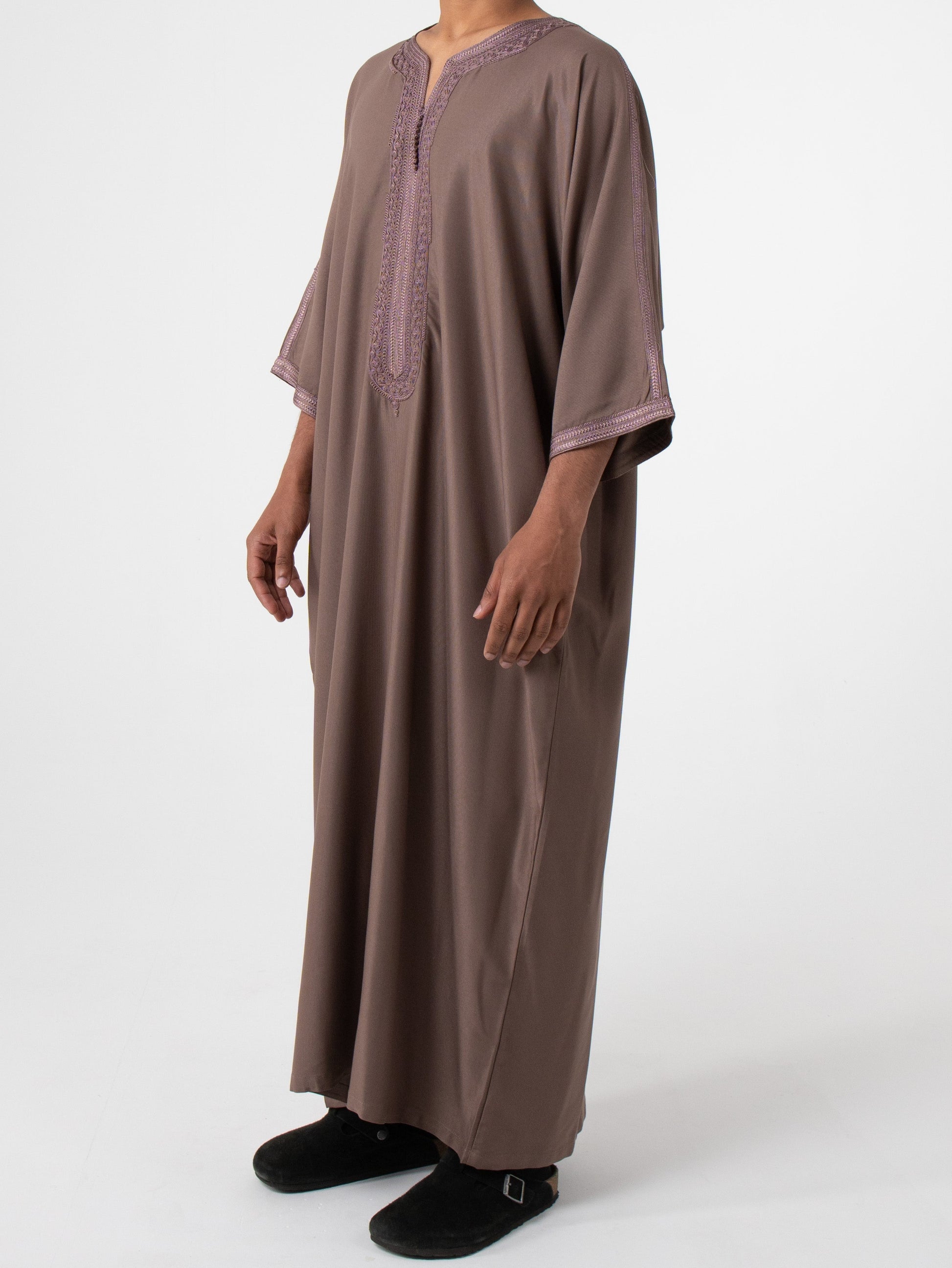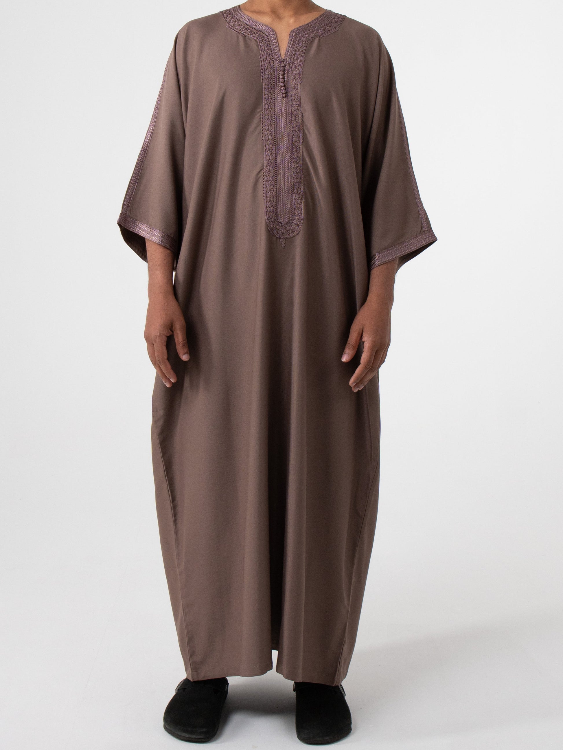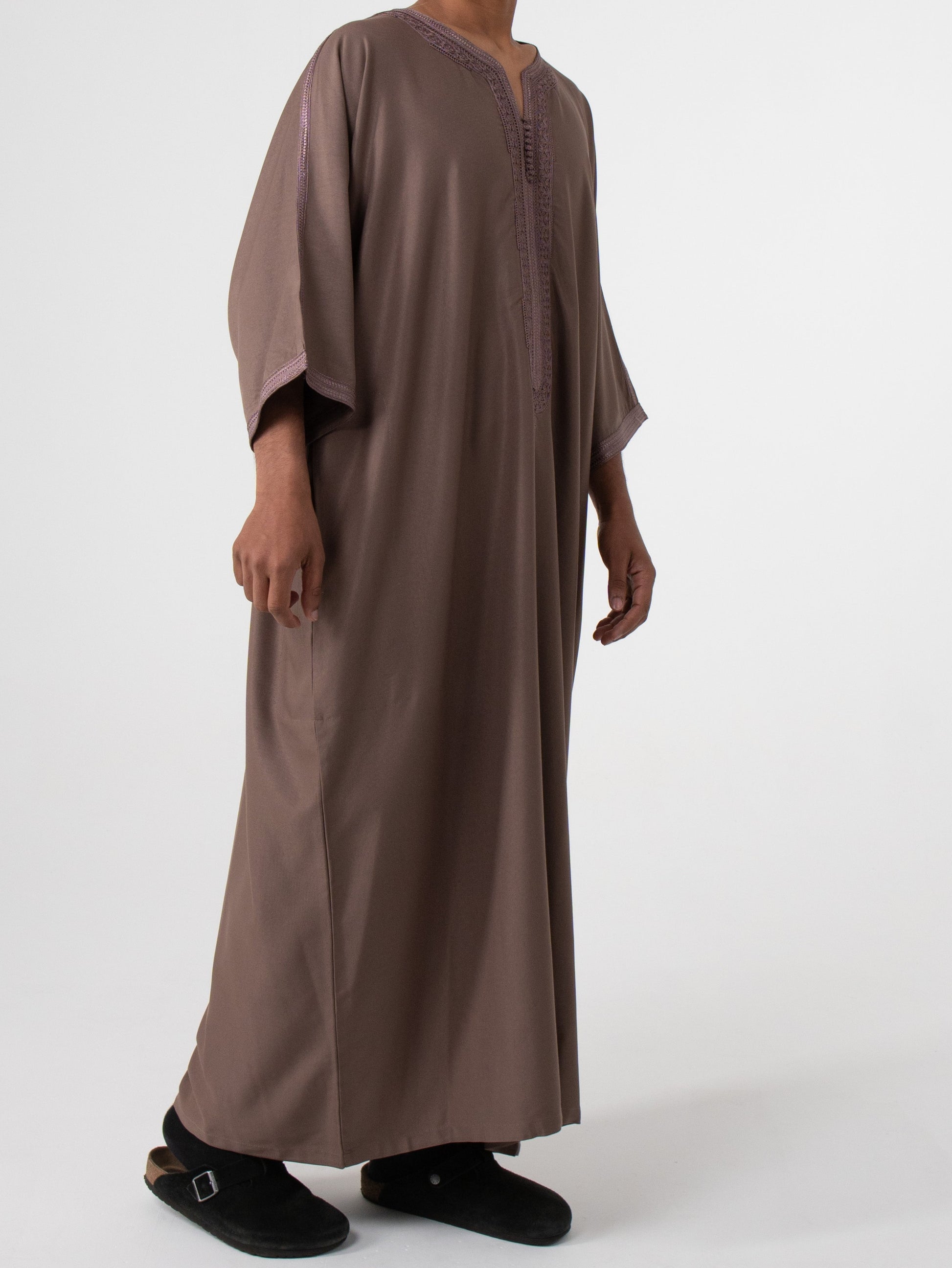 Hand washing is preferred using a gentle detergent in cold or lukewarm water, machine washing is also allowed on a gentle or delicate cycle with similar colours. Please place thobe in a wash bag if using machine wash. After washing, reshape your thobe while still damp and air dry while avoiding direct sunlight. Steaming is preferred, for ironing, Iron on a low setting, turning the thobe inside out to protect any trims. It is normal for the tape to shrink during washing, this will return to normal once ironed inside out on a low setting. Treat stains promptly, and avoid using bleach to maintain the fabric’s quality and colour.